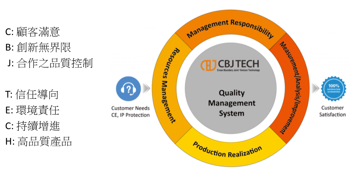 CBJ 致力於提供始終如一的品質以及服務。在符合規範與流程下,透過持續不斷的增進品質管理系統來滿足我們客戶的需求與期待。